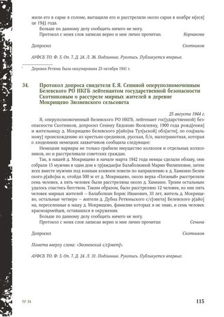 Протокол допроса свидетеля Е.Я. Сениной оперуполномоченным Белевского РО НКГБ лейтенантом государственной безопасности Скотниковым о расстреле мирных жителей в деревне Мокрищево Зюзневского сельсовета. 25 августа 1944 г. // АУФСБ ТО. Ф. 5. Оп. 7. Д. 24. Л. 31. Подлинник. Рукопись. Публикуется впервые.