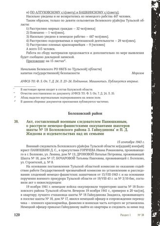 Акт, составленный военным следователем Панюшкиным, о расстреле немецко-фашистскими оккупантами шахтеров шахты № 18 Болоховского района 3. Гайнудинова и П.Д. Жидкова и издевательствах над их семьями. 15 сентября 1943 г. // ГАТО. Ф. P-2515. Оп. 2. Д. 20. Л. 129. Машинопись. Подлинник. Публикуется впервые.