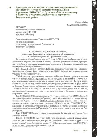 Докладная записка старшего лейтенанта государственной безопасности Лаугалиса заместителю начальника Управления НКГБ СССР по Тульской области полковнику Панфилову о злодеяниях фашистов на территории Болоховского района. 23 июля 1944 г. // АУФСБ ТО. Ф. 5. Оп. 7. Д. 24. Л. 477-479. Подлинник. Машинопись. Публикуется впервые.