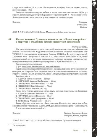 Из акта комиссии Дупнищенского сельсовета Воловского района о зверствах и злодеяниях немецко-фашистских захватчиков. 15 февраля 1942 г. // ГАТО. Ф. P-2515. Оп. 2. Д. 7. Л. 16-16 об. Копия. Машинопись. Публикуется впервые.