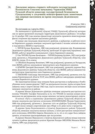 Докладная записка старшего лейтенанта государственной безопасности Соколова начальнику Управления НКВД Тульской области комиссару государственной безопасности Суходольскому о злодеяниях немецко-фашистских захватчиков над мирным населением во время оккупации Дедиловского района. 10 августа 1944 г.