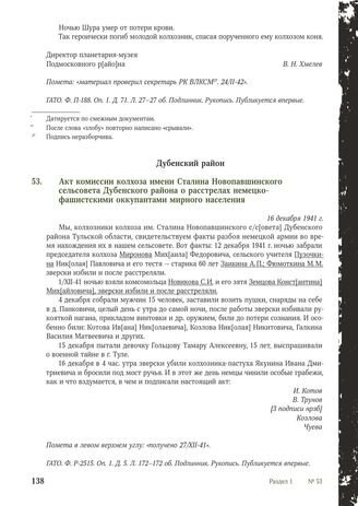 Акт комиссии колхоза имени Сталина Новопавшинского сельсовета Дубенского района о расстрелах немецко-фашистскими оккупантами мирного населения. 16 декабря 1941 г. // ГАТО. Ф. P-2515. Оп. 1. Д. 5. Л. 172-172 об. Подлинник. Рукопись. Публикуется впервые.