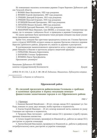 Из сведений председателя райисполкома Соловьева о грабежахи казненных гражданах в период оккупации немецко-фашистскими захватчиками городов и сел Ефремовского района. 1942 г. // ГАТО. Ф. П-177. Оп. 8. Д. 125. Л. 140-140 об. Подлинник. Машинопись. Публикуется впервые.