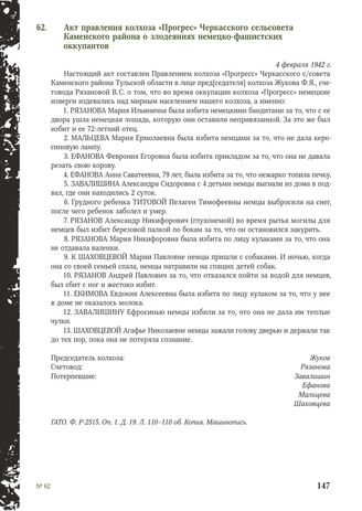 Акт правления колхоза «Прогрес» Черкасского сельсовета Каменского района о злодеяниях немецко-фашистских оккупантов. 4 февраля 1942 г. // ГАТО. Ф. P-2515. Оп. 1. Д. 19. Л. 110-110 об. Копия. Машинопись.