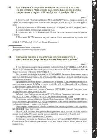 Акт комиссии о зверствах немецких оккупантов в колхозе «15 лет Октября» Черкасского сельсовета Каменского района, совершенных в период с 14 ноября по 14 декабря 1941 г. 1942 г. // ГАТО. Ф. П-177. Оп. 8. Д. 125. Л. 141. Копия. Машинопись.