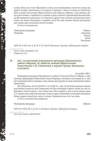 Акт, составленный помощником прокурора Крапивенского района Зябревой, об убийстве немецко-фашистскими захватчиками С.Н. Семиончева в деревне Орлово Орловского сельсовета. 4 октября 1944 г. // ГАТО. Ф. P-2515. Оп. 2. Д. 20. Л. 142. Копия. Рукопись. Публикуется впервые.