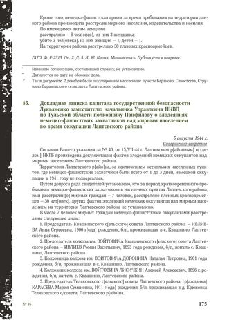 Докладная записка капитана государственной безопасности Лукьяненко заместителю начальника Управления НКВД по Тульской области полковнику Панфилову о злодеяниях немецко-фашистских захватчиков над мирным населением во время оккупации Лаптевского района. 5 августа 1944 г. // АУФСБ ТО. Ф. 5. Оп. 7. Д. 24. Л. 300-300 об. Подлинник. Машинопись. Публикуется впервые.