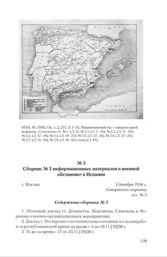 Сборник № 3 информационных материалов о военной обстановке в Испании. г. Москва, 3 декабря 1936 г. Содержание сборника № 3 // РГВА. Ф. 35082. Оп. 1. Д. 278. Л. 163-219. Заверенная копия. Содержание сб. № 3. (Л. 219).