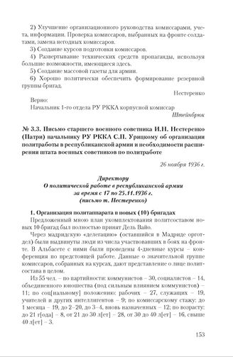 Письмо старшего военного советника И.Н. Нестеренко (Патри) начальнику РУ РККА С.П. Урицкому об организации политработы в республиканской армии и необходимости расширения штата военных советников по политработе. 26 ноября 1936 г. // РГВА. Ф. 35082. Оп. 1. Д. 278. Л. 163-219. Заверенная копия. № 3.3. (Л. 203-200).