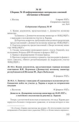 Сборник № 10 информационных материалов о военной обстановке в Испании. г. Москва, 9 марта 1937 г. Содержание сборника № 10 // РГВА. Ф. 35082. Оп. 1. Д. 298. Л. 1-27. Машинописный экз. с заверительной подписью. Содержание сб. № 10. (Л. 1).