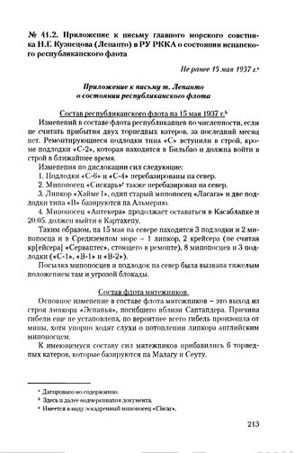 Приложение к письму главного морского советника Н.Г. Кузнецова (Лепанто) в РУ РККА о состоянии испанского республиканского флота. Не ранее 15 мая 1937 г. // РГВА. Ф. 35082. Оп. 1. Д. 368. Л. 1-21. Машинописный экз. с заверительной подписью. № 41.2. (Л. 4-9).