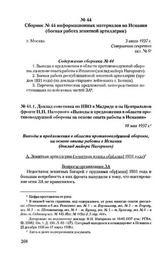 Доклад советника по ПВО в Мадриде и на Центральном фронте Н.Н. Нагорного «Выводы и предложения в области противовоздушной обороны на основе опыта работы в Испании». 10 мая 1937 г. // РГВА. Ф. 35082. Он. 1. Д. 377. Л. 1-35. Машинописный экз. с заверительной подписью. № 44.1. (Л. 2-26).