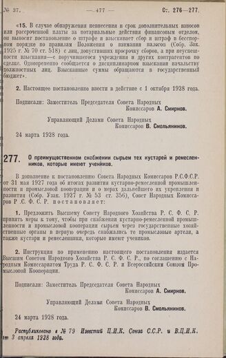 Постановление Совета Народных Комиссаров. О преимущественном снабжении сырьем тех кустарей и ремесленников, которые имеют учеников. 24 марта 1928 года