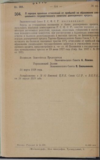 Постановление Экономического Совета. О порядке хранения отчислений от прибылей на образование специального государственного капитала долгосрочного кредита. 31 марта 1928 года // Распубликовано в № 92 Известий Ц.И.К. Союза С.С.Р. и В.Ц.И.К. от 20 апреля 1928 года.
