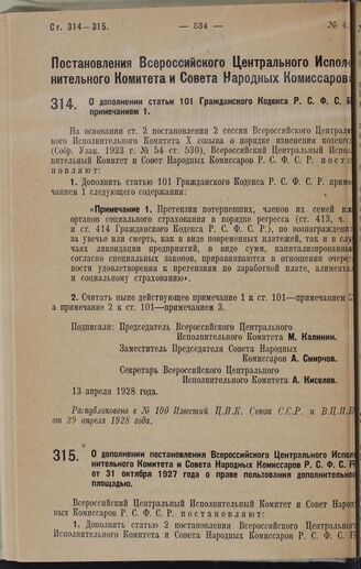 Постановление Всероссийского Центрального Исполнительного Комитета и Совета Народных Комиссаров. О дополнении статьи 101 Гражданского Кодекса Р.С.Ф.С.Р. примечанием 1. 13 апреля 1928 года // Распубликовано в № 100 Известий Ц.И.К. Союза С.С.Р. и В.Ц.И.К. от 29 апреля 1928 года.