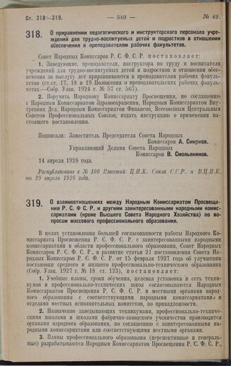 Постановление Совета Народных Комиссаров. О приравнении педагогического и инструкторского персонала учреждений для трудно-воспитуемых детей и подростков в отношении обеспечения к преподавателям рабочих факультетов. 14 апреля 1928 года