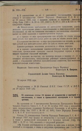 Постановление Совета Народных Комиссаров. Об изменении статьи 19 правил об ученичестве у кустарей и ремесленников, а также в промысловой кооперации и в трудовых артелях. 14 апреля 1928 года