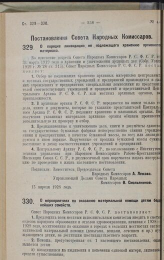Постановление Совета Народных Комиссаров. О мероприятиях по оказанию материальной помощи детям беднейших семейств. 14 апреля 1928 года // Распубликовано в № 103 Известий Ц.И.К. Союза С.С.Р. и В.Ц.И.К. от 5 мая 1928 года.