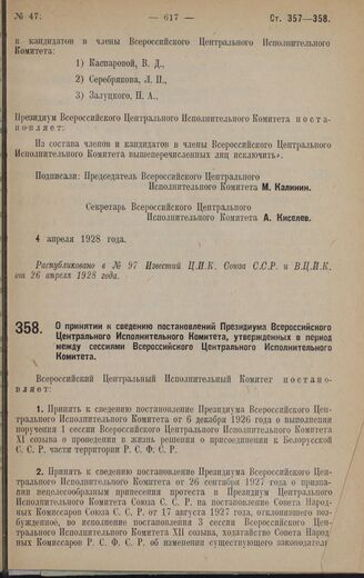 Постановление, принятое на 2 сессии Всероссийского Центрального Исполнительного Комитета XIII созыва. О принятии к сведению постановлений Президиума Всероссийского Центрального Исполнительного Комитета, утвержденных в период между сессиями Всеросс...