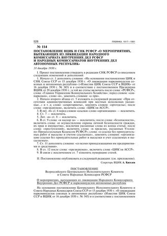 Постановление ВЦИК и СНК РСФСР «О мероприятиях, вытекающих из ликвидации народного комиссариата внутренних дел РСФСР и народных комиссариатов внутренних дел автономных республик». 31 декабря 1930 г.