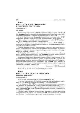 Приказ ОГПУ № 749 «О 14-й годовщине органов ВЧК-ОГПУ». 11 декабря 1931 г.