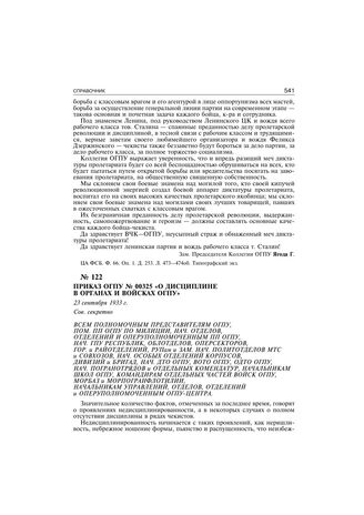 Приказ ОГПУ № 00325 «О дисциплине в органах и войсках ОГПУ». 23 сентября 1933 г. // ЦА ФСБ. Ф. 66. Oп. 1. Д. Л. 542—544. Типографский экз.