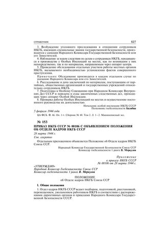 Приказ НКГБ СССР № 00106 с объявлением положения об отделе кадров НКГБ СССР. 28 марта 1944 г.