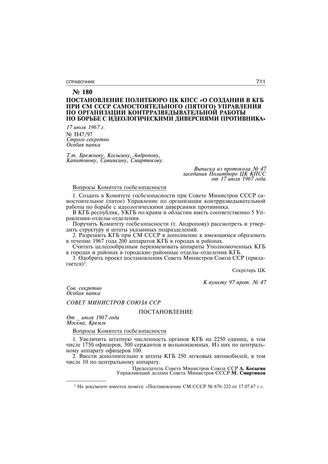 Постановление Политбюро ЦК КПСС «О создании в КГБ при СМ СССР самостоятельного (пятого) управления по организации контрразведывательной работы по борьбе с идеологическими диверсиями противника». 17 июля 1967 г.