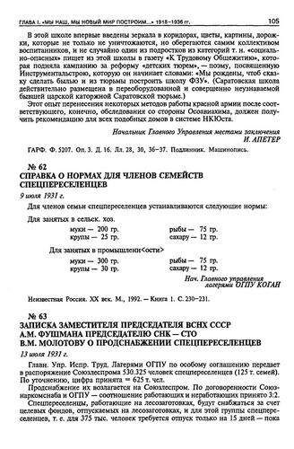 Записка заместителя председателя ВСНХ СССР А.М. Фушмана Председателю СНК — СТО В.М. Молотову о продснабжении спецпереселенцев. 13 июля 1931 г. // Неизвестная Россия. XX век. М., 1992. — Книга 1. С. 234.
