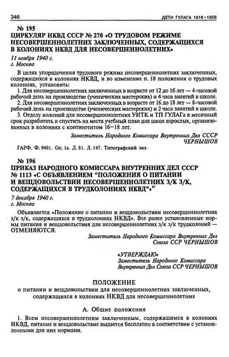 Приказ Народного Комиссара Внутренних Дел СССР № 1113 «С объявлением “Положения о питании и вещдовольствии несовершеннолетних з/к з/к, содержащихся в трудколониях НКВД”». 7 декабря 1940 г.