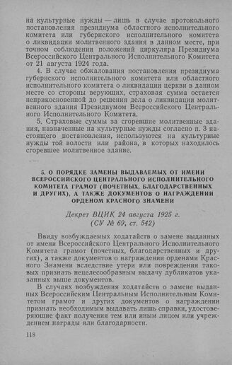 О порядке замены выдаваемых от имени Всероссийского Центрального Исполнительного Комитета грамот (почетных, благодарственных и других), а также документов о награждении орденом Красного Знамени. Декрет ВЦИК 24 августа 1925 г. // СУ № 69, ст. 542.