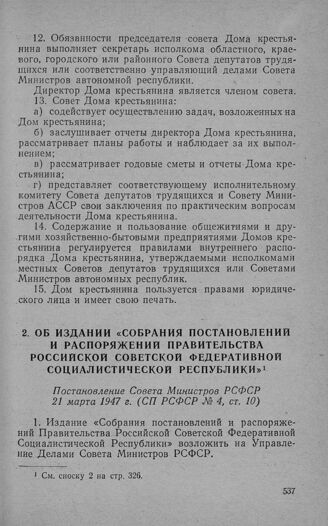 Об издании «Собрания постановлений и распоряжений Правительства Российской Советской Федеративной Социалистической Республики». Постановление Совета Министров РСФСР 21 марта 1947 г.