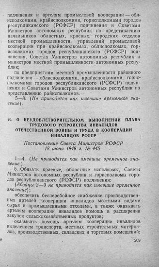 О неудовлетворительном выполнении плана трудового устройства инвалидов отечественной войны и труда в кооперации инвалидов РСФСР. Постановление Совета Министров РСФСР 18 июня 1949 г. № 445