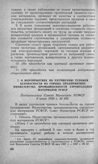 О мероприятиях по улучшению техники безопасности на горных предприятиях Министерства промышленности строительных материалов РСФСР. Постановление Совета Министров РСФСР 9 июня 1950 г. № 686