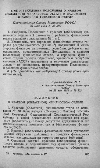 Об утверждении Положения о краевом (областном) финансовом отделе и Положения о районном финансовом отделе. Постановление Совета Министров РСФСР 26 мая 1951 г . № 502