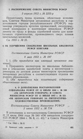О дополнении постановлений Совнаркома РСФСР от 12 июля 1944 г. № 540 «Об авторском гонораре» и Совета Министров РСФСР от 15 июля 1947 г. № 521 «Об авторском гонораре за литературно-художественные произведения». Постановление Совета Министров РСФСР 5 июня 1952 г. № 714