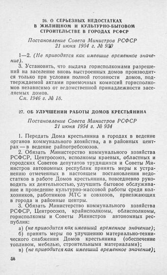 О серьезных недостатках в жилищном и культурно-бытовом строительстве в городах РСФСР. Постановление Совета Министров РСФСР 21 июня 1954 г. № 930