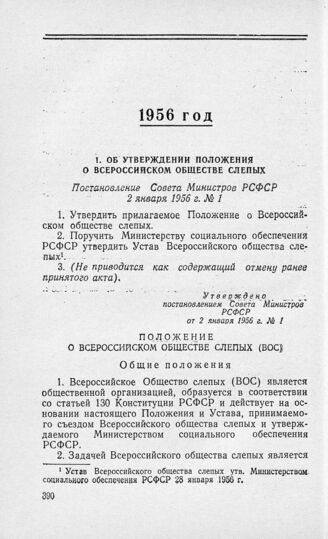 Об утверждении Положения о Всероссийском обществе слепых. Постановление Совета Министров РСФСР 2 января 1956 г. № 1