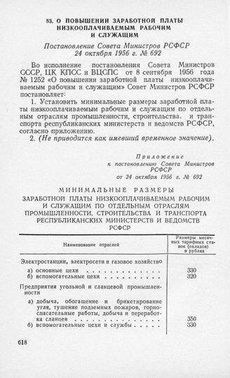 О повышении заработной платы низкооплачиваемым рабочим и служащим. Постановление Совета Министров РСФСР 24 октября 1956 г. № 692