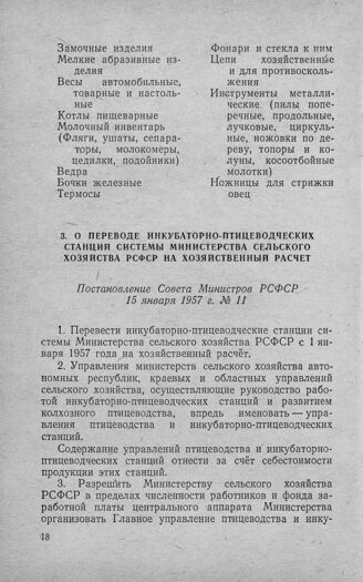 О переводе инкубаторно-птицеводческих станций системы Министерства сельского хозяйства РСФСР на хозяйственный расчет. Постановление Совета Министров РСФСР 15 января 1957 г. № 111