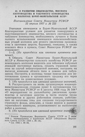 О развитии овцеводства, мясного скотоводства и табунного коневодства в колхозах Бурят-Монгольской АССР. Постановление Совета Министров РСФСР 22 апреля 1957 г. № 225
