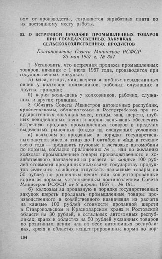 О встречной продаже промышленных товаров при государственных закупках сельскохозяйственных продуктов. Постановление Совета Министров РСФСР 25 мая 1957 г. № 351