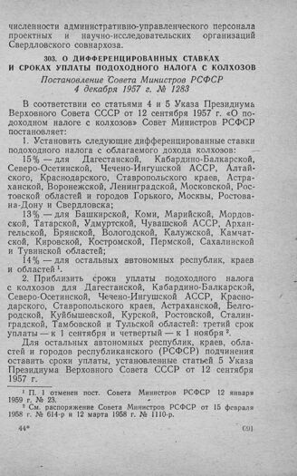 О дифференцированных ставках и сроках уплаты подоходного налога с колхозов. Постановление Совета Министров РСФСР 4 декабря 1957 г. № 1283