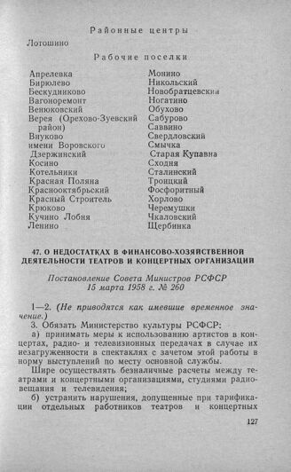 О недостатках в финансово-хозяйственной деятельности театров и концертных организаций. Постановление Совета Министров РСФСР 15 марта 1958 г. № 260