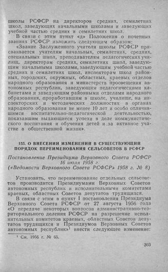 О внесении изменений в существующий порядок переименования сельсоветов в РСФСР. Постановление Президиума Верховного Совета РСФСР 16 июля 1958 г. // «Ведомости Верховного Совета РСФСР» 1958 г. № 8.
