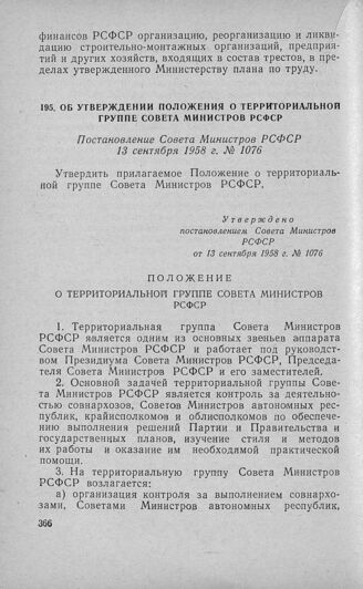 Об утверждении Положения о территориальной группе Совета Министров РСФСР. Постановление Совета Министров РСФСР 13 сентября 1958 г. № 1076