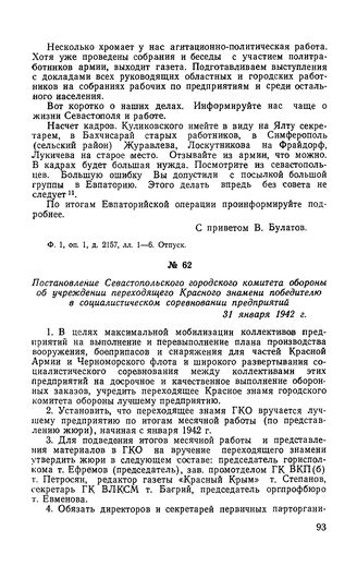 Постановление Севастопольского городского комитета обороны об учреждении переходящего Красного знамени победителю в социалистическом соревновании предприятий. 31 января 1942 г.