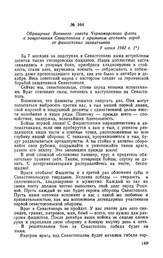 Обращение Военного совета Черноморского флота к защитникам Севастополя с призывом отстоять город от фашистских захватчиков. 9 июня 1942 г.