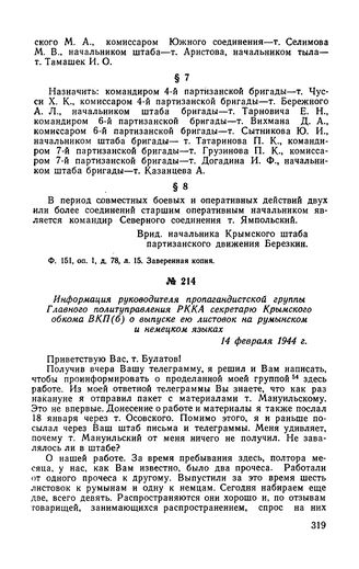 Информация руководителя пропагандистской группы Главного политуправления РККА секретарю Крымского обкома ВКП(б) о выпуске ею листовок на румынском и немецком языках. 14 февраля 1944 г. // Ф. 151, оп. 1, д. 222, лл. 55-58. Подлинник.