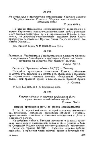 Из сообщения о присуждении переходящего Красного знамени Государственного Комитета Обороны восстановителям железных дорог. 20 мая 1944 г. // Газ. «Красный Крым», № 47 (5820), 20 мая 1944 г.